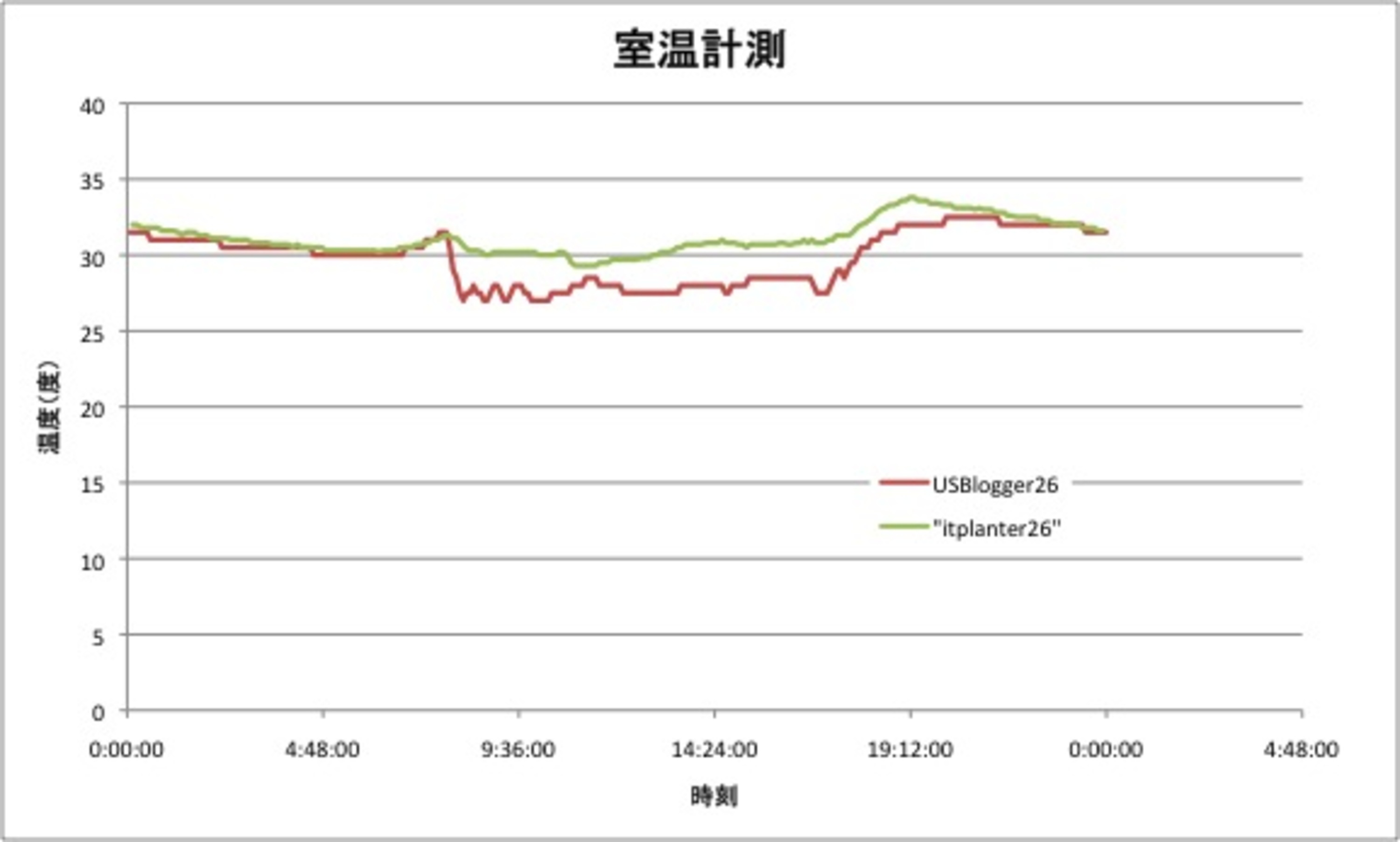 アイティプランターには温度センサーが内蔵されています。パソコンを接続すれば、温度を記録することができます。アイティプランターの温度センサーとデータロガーの温度とを比較してみました。アイティプランターの温度センサーはアイティプランターの内部に格納されているので、エアコン稼動時の影響を受けにくいようです。エアコンが停止して時間が経過すると、データロガーの温度の値とアイティプランターの温度センサーの値は一致します。